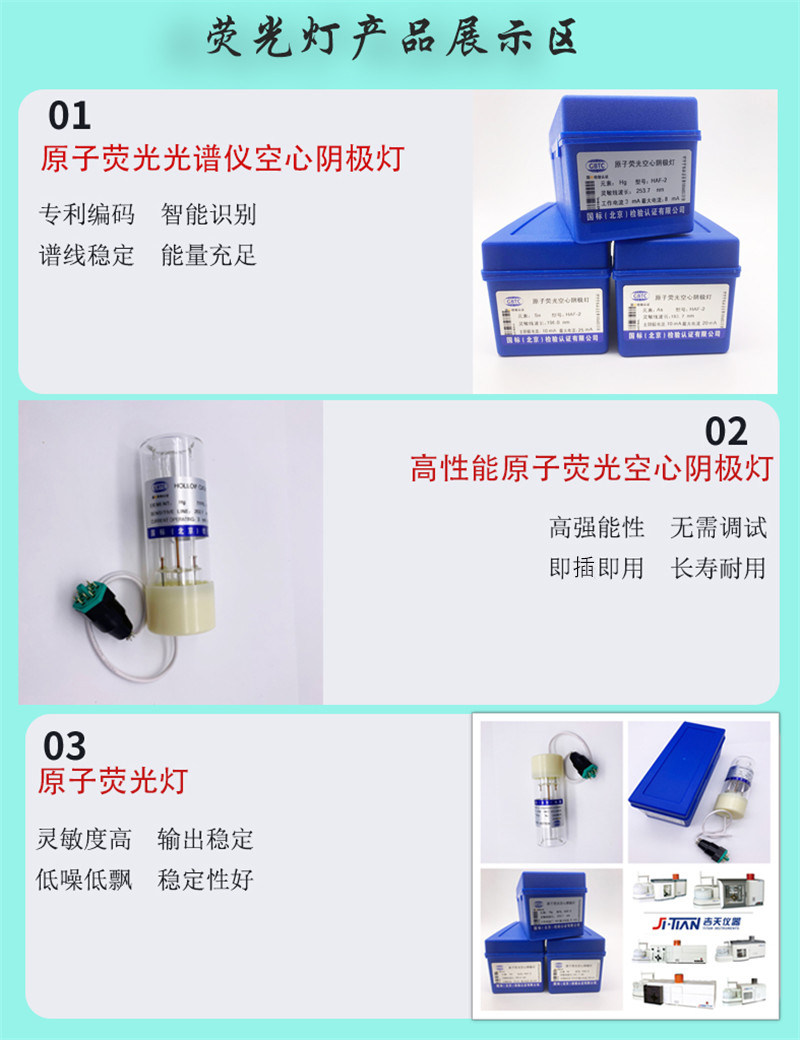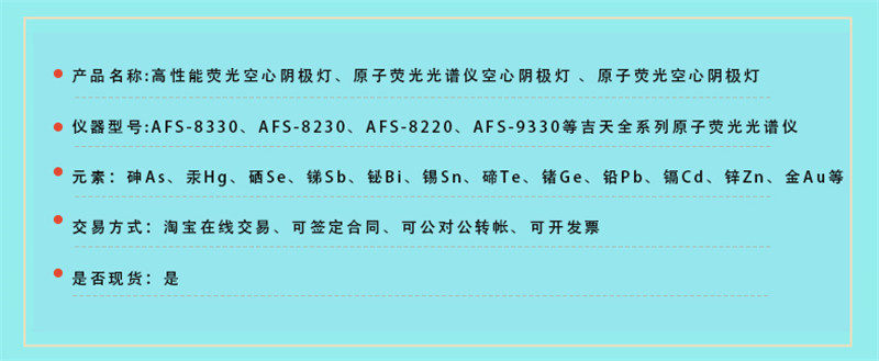 本店常年现货供应高性能原子荧光空心阴极灯,适用北京吉天 、北京海光、 北分瑞利、 普析通用 、博辉创新 、东西分析 、北京宝德 、 北京金索坤、 湖北汇瑞通 、上海美析、 北京锐光、 南京科捷、 北京卓信、 天津港东 、湖北特创、加拿大欧罗拉 等国内外各品牌原子荧光分光光度计。 批发零售,规格齐全、诚征分销。我们欢迎您的光临!